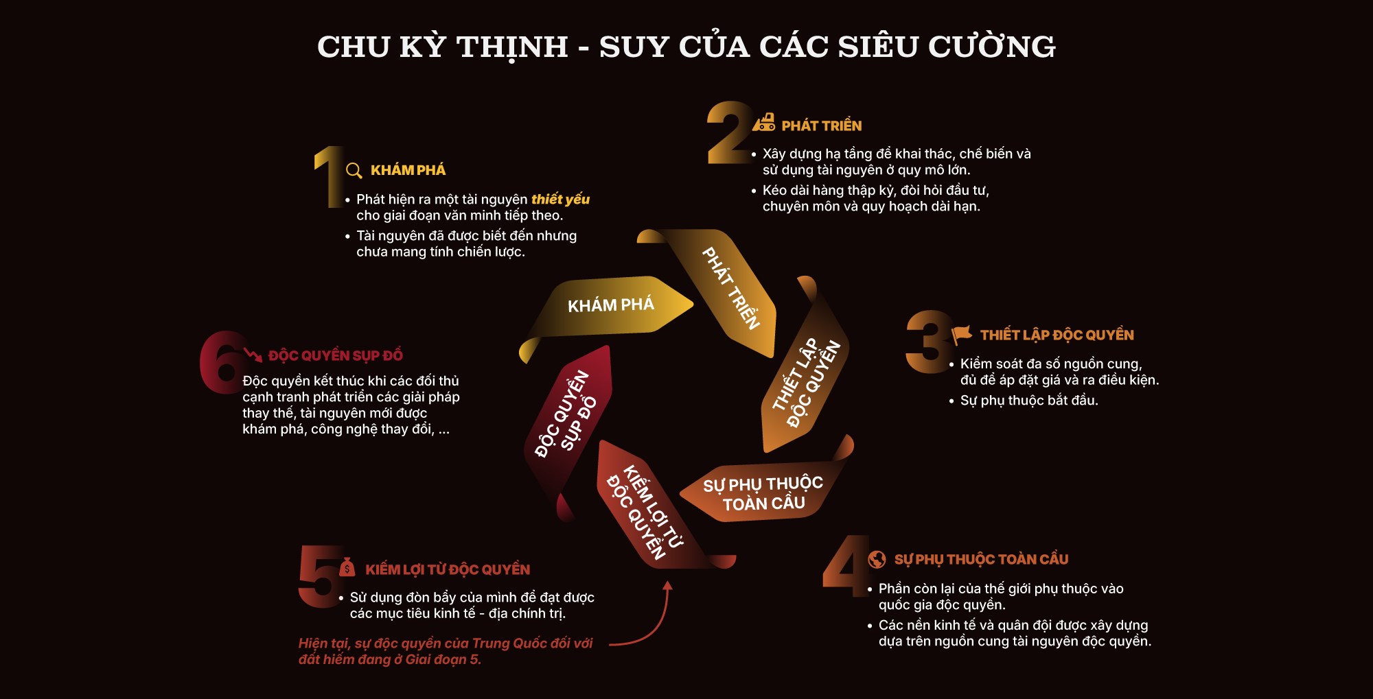 Một số tài liệu cho thấy trong lịch sử, việc nắm độc quyền một tài nguyên chiến lược thường tuân theo một chu kỳ 6 giai đoạn: Khám phá, Phát triển, Độc quyền, Phụ thuộc, Tận dụng đòn bẩy, và Sụp đổ.
